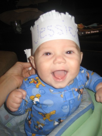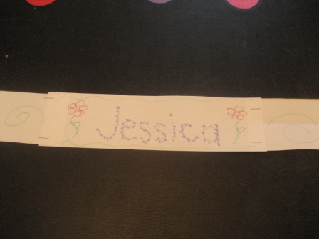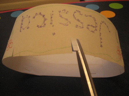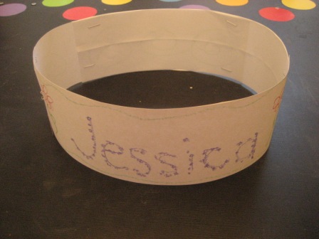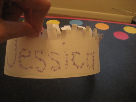 Activity: Trace name, decorate and cut fringe on their “crown.”