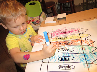 However, as soon as my youngest went down for a nap, James pulled out his school supplies… this time his markers. I drew several over-sized crayons onto paper and wrote different color names on them. James then had to sound out each of the words: “/r/ /e/ /d/… RED!” and then he had to find the red marker to color the red crayon. “/y/ /e/ /l/ /l/ /o/ /w/ Yelulahwuh! YELLOW!” Yup, a little trickier since the sounds changed up at the end. “/o/ /r/ /a/ /n/ /g/ /e/… um… what does THAT say?” Haha that one can trip anyone up! Here’s where we had a mini-lesson: “James, the letters o and r together say /or/. Can you think of a color that starts with /or/?”